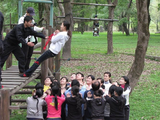 全队每个人轮流上到背摔台上背向队友,双脚后跟1/3出台面,(培训师做出示范动作)身体重心上移尽量垂直水平倒下去,下面的队员安全把他接住即为完成。在做这个项目的过程中需要注意;首先,背摔队员在背摔台只能严格按照动作要领来做才可以保证足够安全,特别要遵守以下四点;不要向后窜跃、倒下时肘关节收紧不要打开、不要垂直向下跳、要控制自己的双脚不要上下摇动并打开,其次,搭人床的队员第一组队员的肩膀距背摔台沿约30公分的距离,个子可以不用很高,通常可以安排为女士;第二、三组应用力度最强的四个人,当然,如果背摔者的个子较高受力点应向后调节。每组队员的肩膀应紧密相连勿留空隙;人床形状应保持由低渐高的坡状,剩下的队员要用双掌推住最后一组队友的肩膀处,以保护人床的牢固,所有队员在任何时候都不可以撒手或撒退;当听到背摔队员的询问:准备好了吗时,头要向后仰同时侧向队友的背部,当队友倒下来后一定遵守“先放脚后将身体扶正”的拓展安全第一原则;另外,做保护的队员不要迅速撒手或鼓掌,以免发生其他意外。最后,二、三组队员在承接几名队员后要互相交换组位以免疲劳