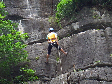 选择速降的悬崖,首先必须探测悬崖高度和崖面及崖底是否平坦,忌有突出明显的尖棱角岩块,坡度不易太大,崖顶要有适合的大树或巨石来挂保护绳。